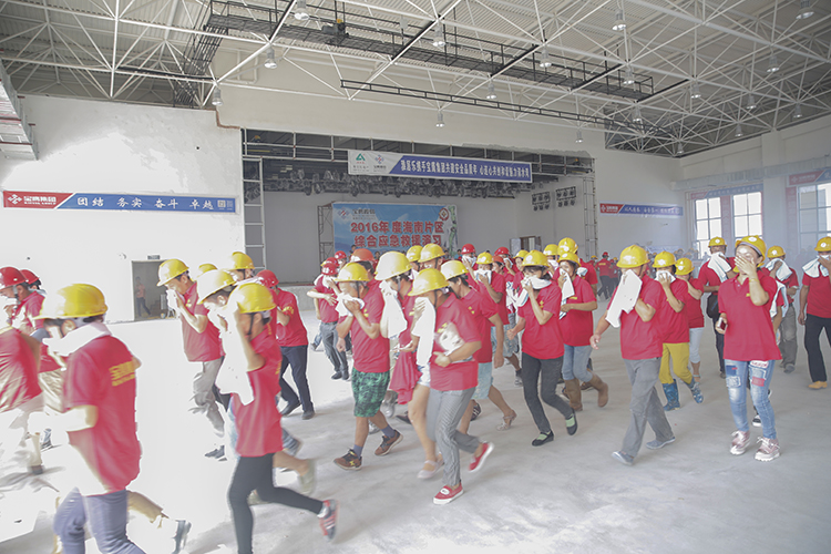 演習(xí)項目分為防臺風(fēng)演習(xí)、防雨汛演習(xí)、消防疏散演習(xí)三個大項,分別模擬了觸電、中暑、火災(zāi)、暴雨臺風(fēng)等工地常見的突發(fā)安全事件和海南當(dāng)?shù)爻0l(fā)的自然氣象災(zāi)害。在觸電事件發(fā)生后,演練人員封鎖事件現(xiàn)場、撥打120急救熱線、按照正確的自救方法對傷員進行救治,迅速報告項目安全人員,同時等待專業(yè)救助人員前來救治。在火災(zāi)發(fā)生后,現(xiàn)場濃煙密布,演練人員迅速自發(fā)分為三隊從安全通道有秩序地撤離現(xiàn)場。暴雨、中暑等演練亦遵循各自的特點,在模擬實戰(zhàn)中為觀摩人員獻上豐富的一課。在滅火演練中,寶鷹集團總裁成湘文上陣為觀摩者示范了消防設(shè)備的使用方法。