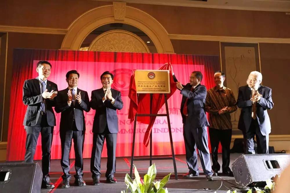 王榮、阿里夫、托馬斯、熊德龍、古少明、李棟為印度尼西亞廣東總商會(huì)成立揭牌