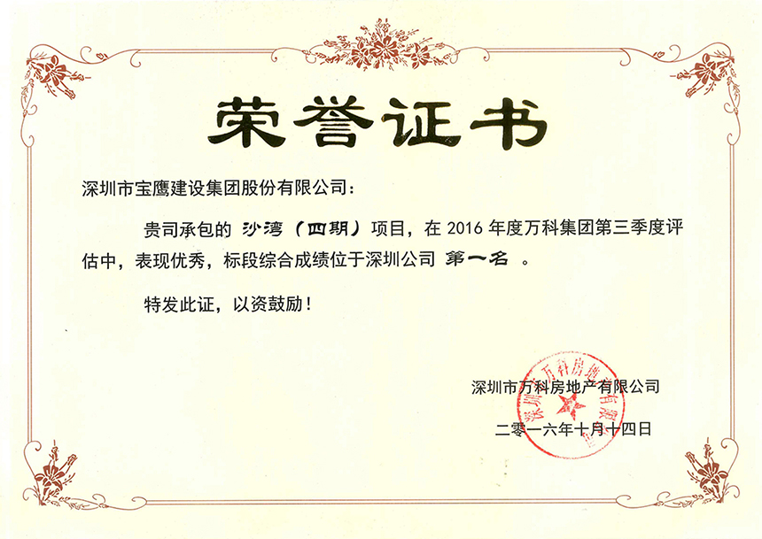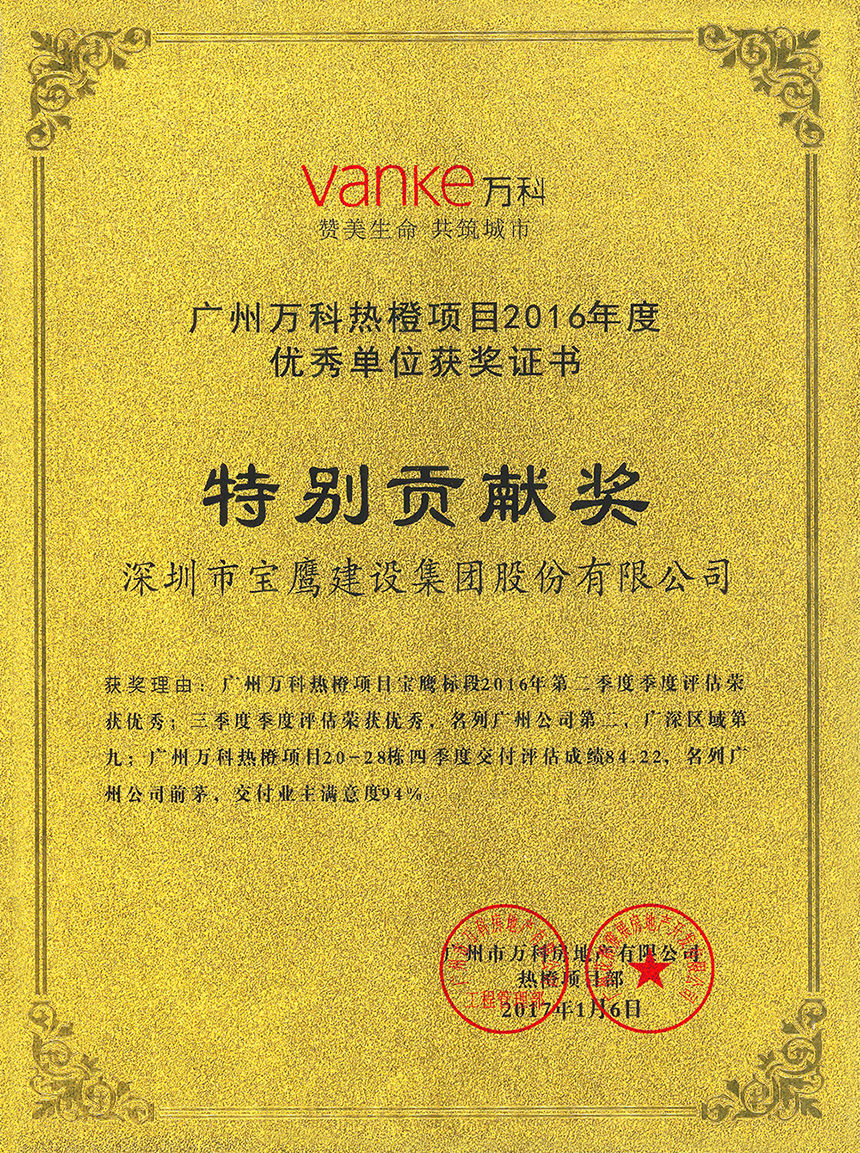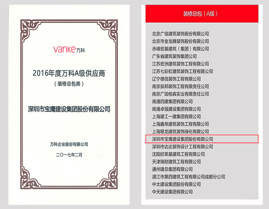據(jù)了解,此次萬科集團正式發(fā)布的“2016年合格供應(yīng)商名錄”,是萬科集團對評估方法再次升級后,將第三方質(zhì)量評估成績、天網(wǎng)行動材料檢測合格率、客服返修率以及分公司合作反饋等多個維度相結(jié)合,建立可量化、可考核、可追溯的全維度評估體系的結(jié)果。本次,萬科集團分別對總包、裝修總包、景觀綠化、門窗幕墻、材料設(shè)備五大類供應(yīng)商進行了評估分級,五大類合格供應(yīng)商各分A、B、C三個級別,共965家,其中“A級供應(yīng)商”117家,裝修總包類A級供應(yīng)商22家。寶鷹集團憑借過硬的綜合成績?nèi)雵?016年度萬科A級供應(yīng)商行列,成為獲獎名單中深圳僅有的兩家建筑裝飾A級供應(yīng)商之一。